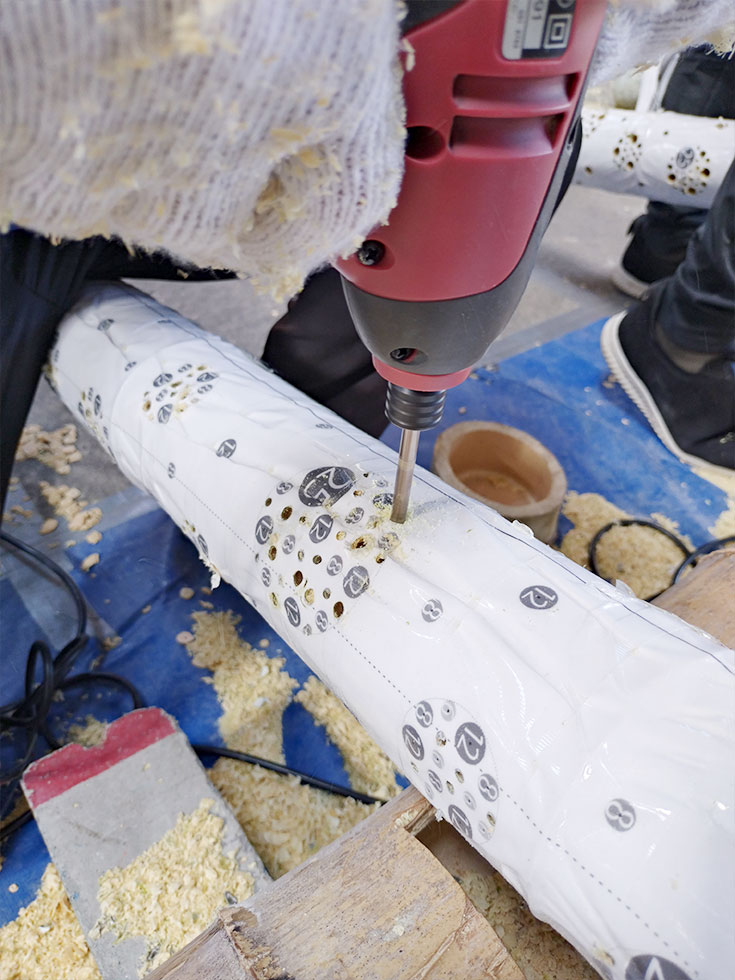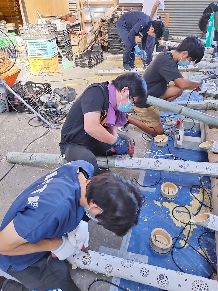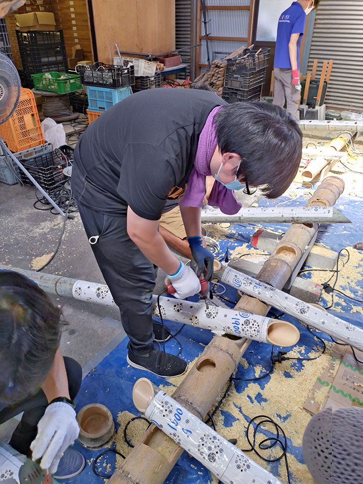 「竹灯り宵」制作ボランティア活動への参加 2025年10月14日 令和7年10月10日(金)、社会福祉法人ウエルプラザでは、10月25日(土)に芸西村の琴ヶ浜で開催されるイベント「竹灯り宵」の制作ボランティア活動に、7名の職員が参加しました。 法人では、昨年より制作ボランティア活動への参加を開始し、今年は2年目となりました。 様々な模様のデザインに従って、電動ドリルで一つ一つ大きさを変えながら手作業で行います。 とても大変な作業でしたが、イベントでの点灯を楽しみにしています。