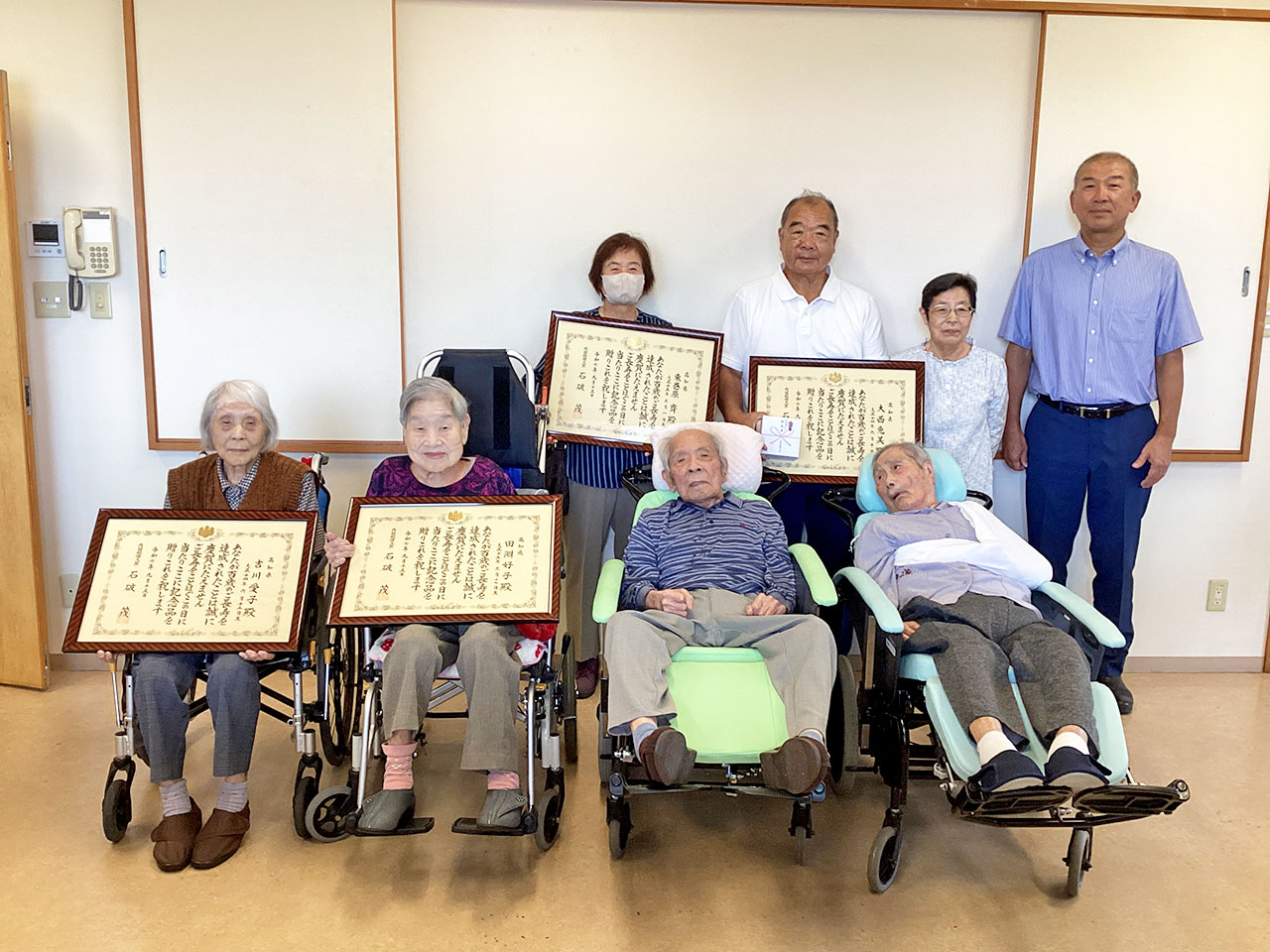 松本村長様から100歳を迎えられた4名の入居者様に対し、内閣総理大臣の表彰状と記念品として銀杯が手渡されました。