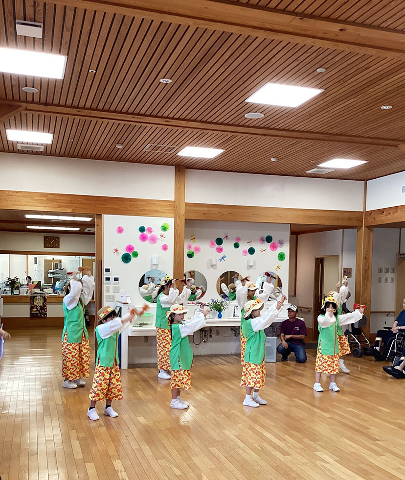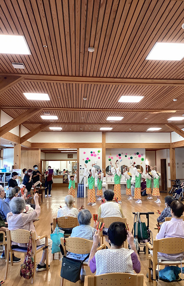 踊り子隊は小学生が中心であり、入居者さんも孫を見るようにやさしい表情を見せていました。踊り始めると入居者さんも音楽に合わせ、リズムを取りながら踊ったり、手拍子をしたりしていました。