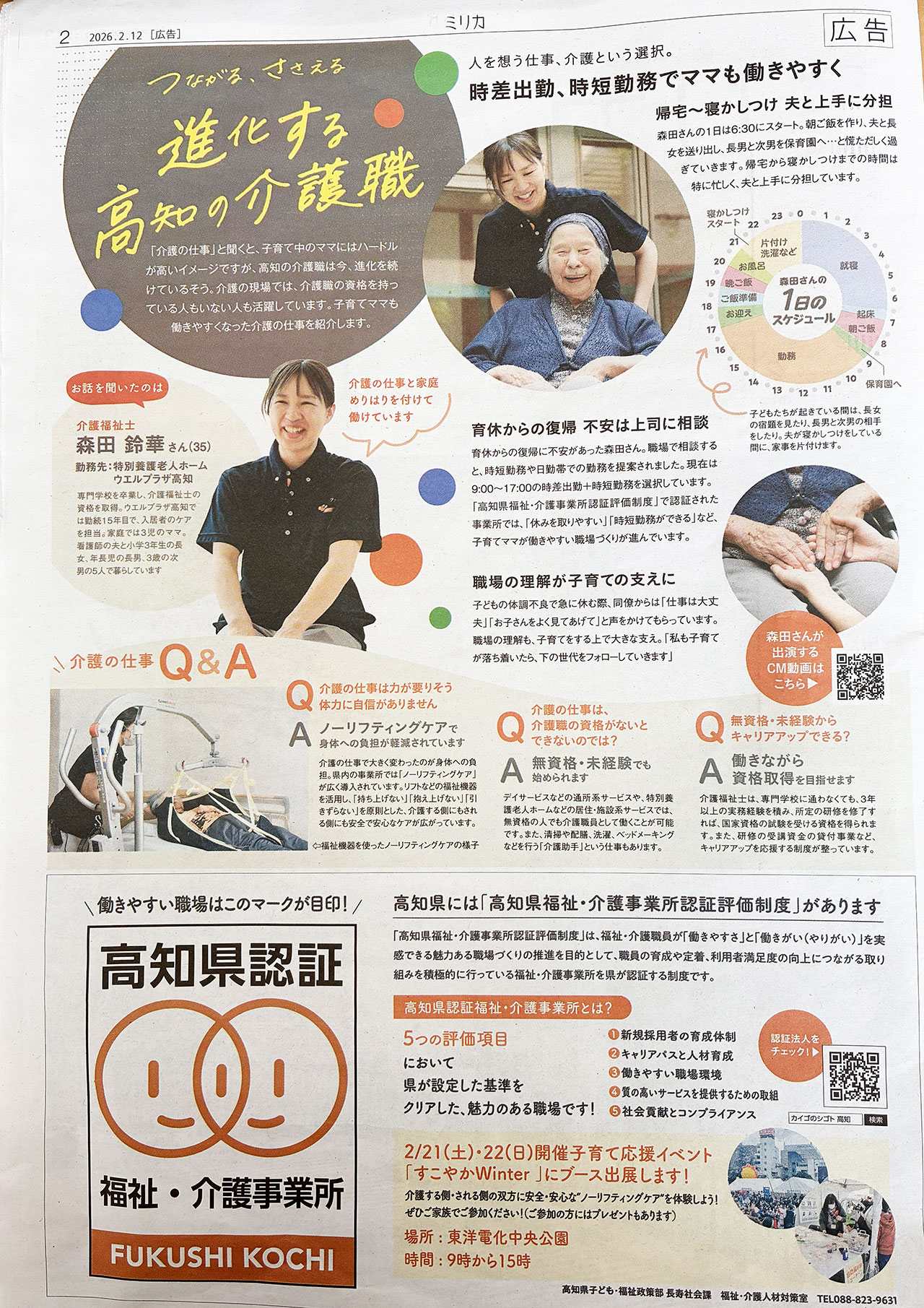 「ミリカ」に掲載されました ~特別養護老人ホームウエルプラザ高知~ 2026年2月13日 当施設の職員、森田 鈴華さんが子育て中のママとして、2月12日(木)発刊の無料生活情報誌「ミリカ」に掲載されました。 また「カイゴのシゴト(高知県 介護人材応援サイト)」内にある、「つながる ささえる 進化する高知の介護職」に森田 鈴華さんが出演しているCM動画もあります。 是非QRコードを読み取っていただき、ご覧ください。